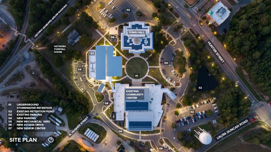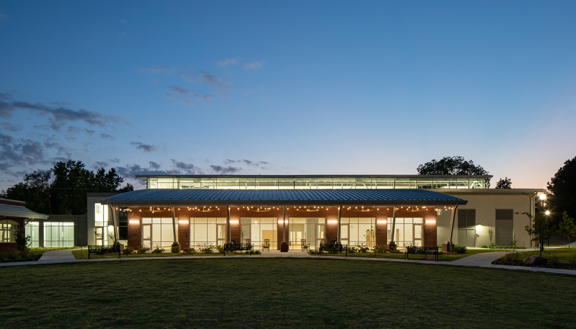 The Senior Center sits on the site of the historic Tunstall House, the highest point along the former Seaboard Air Line Railway. This prime location inspired a modern take on local architectural traditions. Nearby buildings reference Apex’s historic train station, using classic rooflines, detailing, and materials. The Senior Center, in turn, builds on these cues and reinterprets them with a contemporary design. For example, it features shallow curved metal roofs, angled columns, exposed structure, and a wide covered porch.