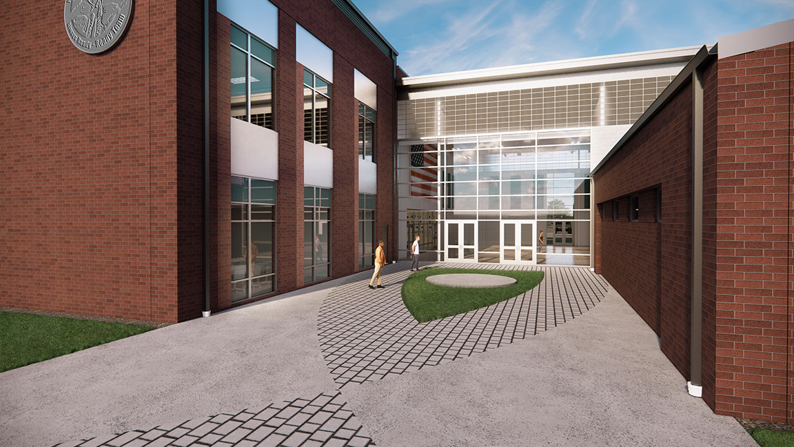 The building will include administrative offices, classrooms, an assembly hall, a kitchen, fitness areas, locker rooms, and secure unit storage. The facility will also include a guard shack, retention ponds, a future helipad location, military-owned vehicle parking, and a perimeter running track.