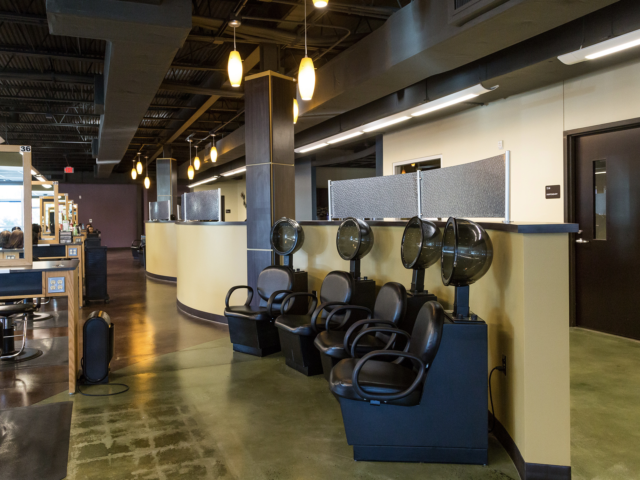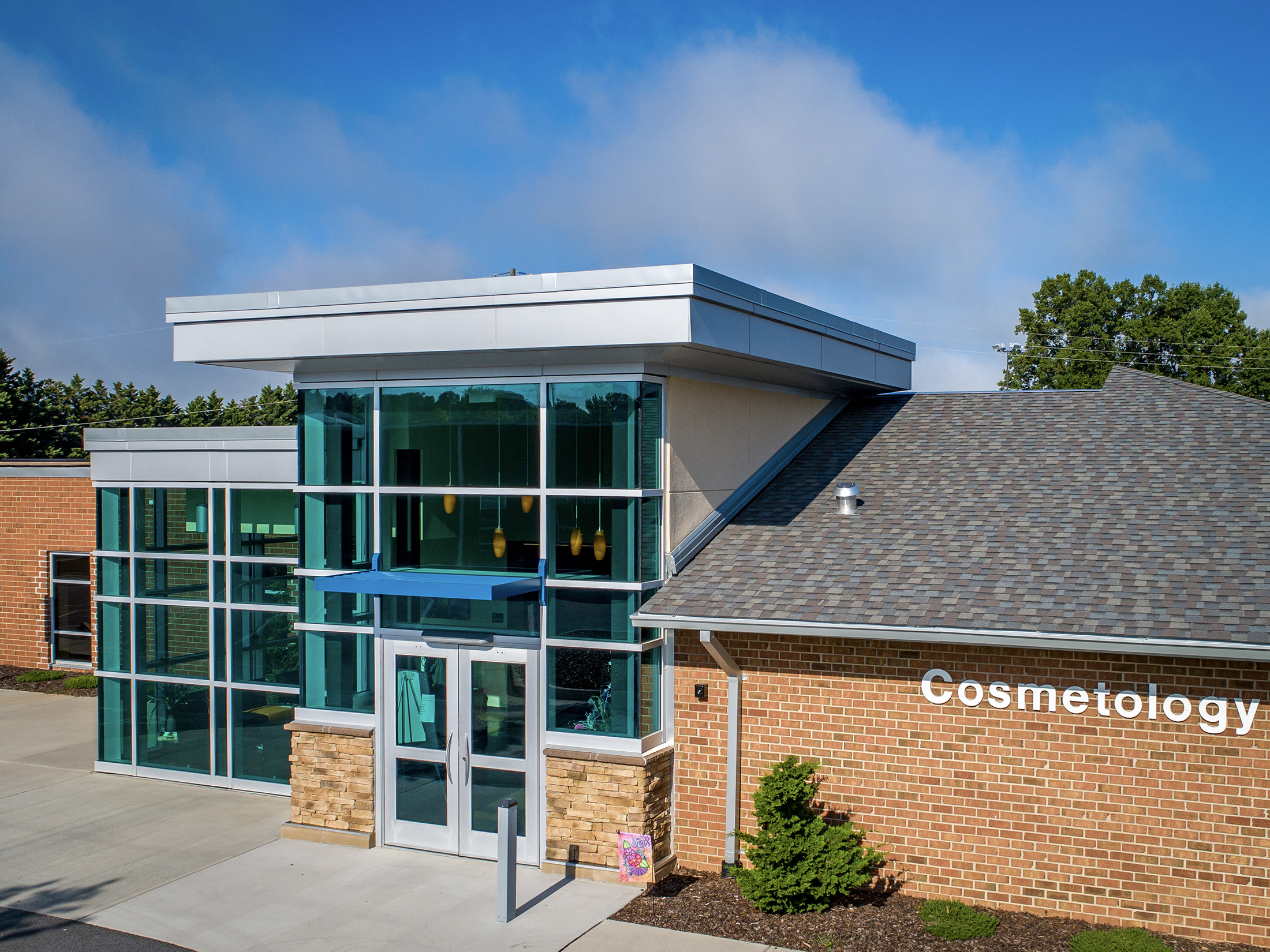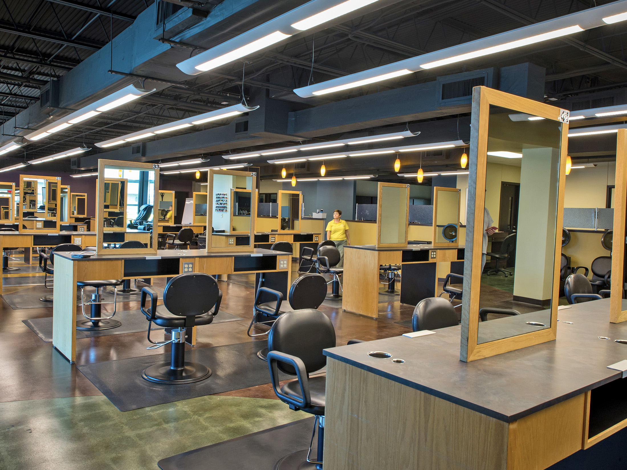 The new Cosmetology Center provides over 10,00 square feet of training and classroom space to accommodate the growing program including: 44 student styling stations, three classrooms, 10 shampoo stations, lobby featuring extensive class for day lighting, and several additional cosmetology training spaces.